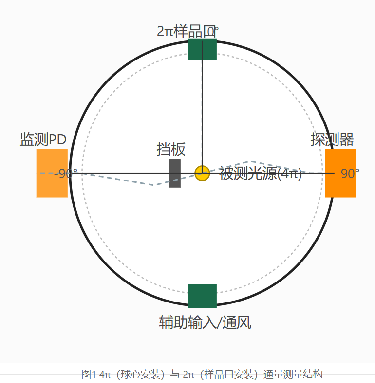 4π(燈在球心)或2π(被測光源貼在樣品口)