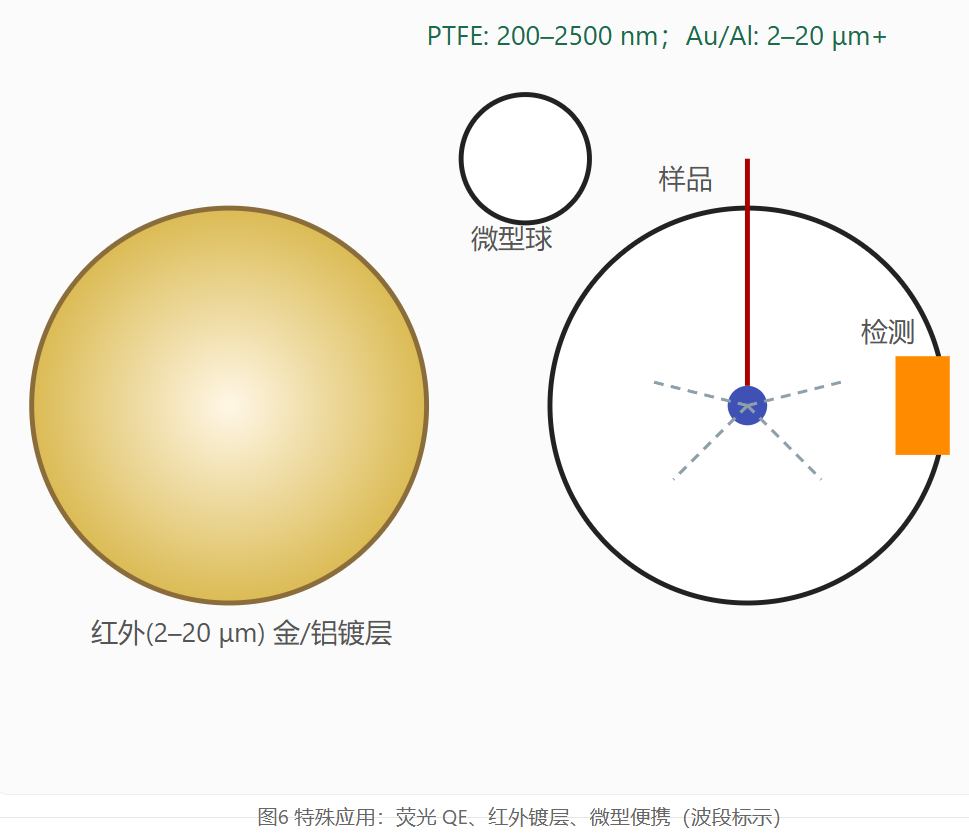 涂覆或燒結(jié)高反射率漫反射材料(如PTFE、BaSO?、Spectralon),在200–2500 nm甚至更寬的光譜范圍內(nèi)可達到 95–99% 的高反射率。